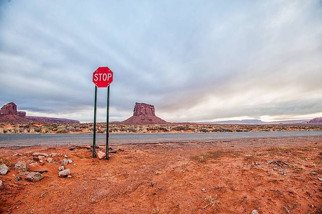 STOP标志在美国很常见,有点类似红绿灯的意思。遇到STOP标志,路口必须停车,即便没车,也默数三个数再走。城市内,有时后车会按喇叭催促,不要管他。如果有车,就是谁先到达路口,谁先通行。比如十字路口,四个方向都有STOP标志,那就谁先到,谁先走;你看比你先到的车走了,你就可以走了,绝对不要抢行。但如果十字路口,只有两个方向有STOP标志,那意味着必须让没有STOP标志的主路车先走,然后你才能通过。