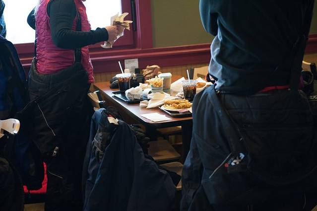 冬季的黄石并不是与世隔绝,在这里有餐厅、有客房。那些骑雪地摩托的,有些就住在这里,更深入的游玩。而且这里的餐食并不贵,而且常规种类的快餐都有。这个鸡排有手掌那么大,给了3块,薯条给的也很多,我们一家三口没吃完。带来的三明治都没吃。