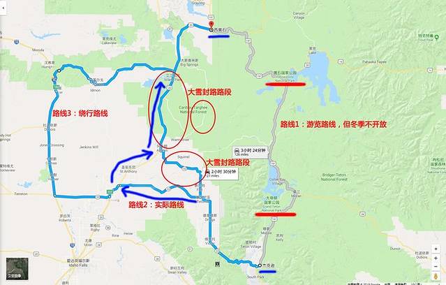 路线:1:日常游览都是走这条,大提顿和黄石其实是一体,只是分在了2个州,所以分别起名字。如果不是冬季,就可以一路游览过去。但是在冬季,这里就封闭了,不能走的。