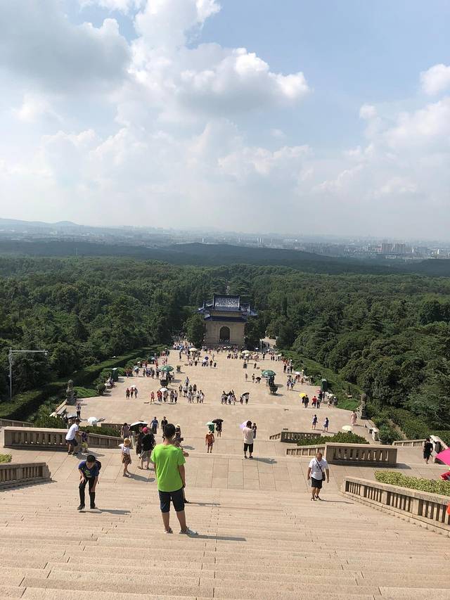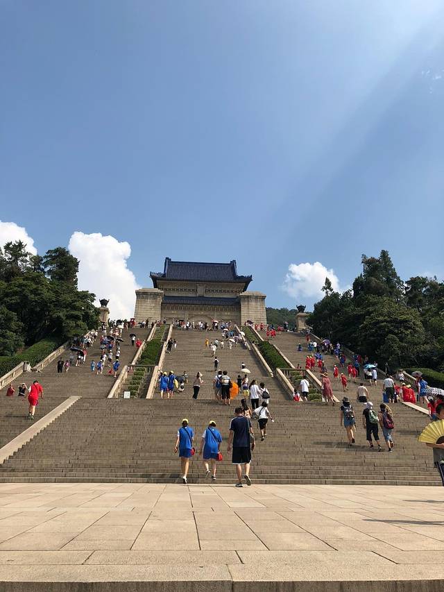 今天第一个参观的景区就是离我们酒店最近的中山陵,这是中国近代伟大的民主革命先行者孙中山先生的陵寝。中山陵前临平川,背拥青嶂,东毗灵谷寺,西邻明孝陵,整个建筑群依山势而建,由南往北沿中轴线逐渐升高,主要建筑有博爱坊、墓道、陵门、石阶、碑亭、祭堂和墓室等,排列在一条中轴线上,体现了中国传统建筑的风格,从空中往下看,像一座平卧在绿绒毯上的“自由钟”。融汇中国古代与西方建筑之精华,庄严简朴,别创新格。