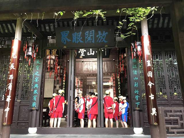 导游介绍说:平山堂前花木扶疏,庭院非常幽静,当时凭栏远眺江南诸山,恰与视线相平,"远山来与此堂平",故称"平山堂"。在堂前一副对联:"过江诸山到此堂下,太守之宴与众宾欢",是欧阳修当年潇洒流运的生动写照。是不是和“醉翁之意”相得益彰?