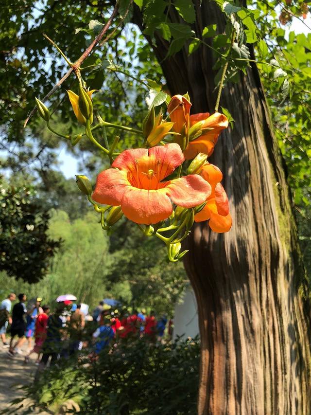 看到这大家都会想到枯木逢春的成语吧?娇艳的绿叶鲜花和枯死的枝干形成了强烈的对比,让人不禁想到了“病树前头万木春”的诗句,慨叹生命的神奇!后来导游介绍,这橘色鲜艳的花儿正是凌霄花。曾经给孩子讲过很多遍《致橡树》,却不曾真正见过凌霄花。原来她真的是这样美丽,怪不得要借高枝炫耀自己的美呢!