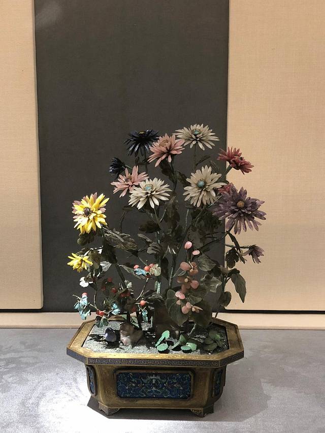 铜镀金嵌玉盆景,仿佛真的一样,花瓣都是自然错落的。