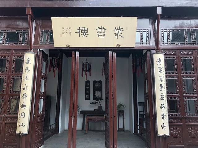 丛书楼,导游带着我们参观时特意卖了一个关子,为什么楼内没有上楼的楼梯,他们是怎样上楼的?果然,我们绕了一圈也没发现楼梯。到后来导游才告诉我们,原来在楼后的假山上有石阶式的山路曲折地通往丛书楼二楼。这就是“书山有路勤为径”!不禁感叹主人的用心之巧!两侧的对联内容为:清气若兰虚怀当竹,乐情在水静趣同山。