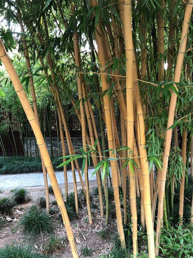 金镶玉竹,为竹中珍品,其珍奇处在那嫩黄色的竹竿上,于每节生枝叶处都天生成一道碧绿色的浅沟,位置节节交错。一眼望去,如根根金条上镶嵌着块块碧玉,清雅可爱。