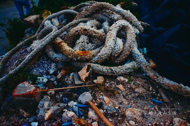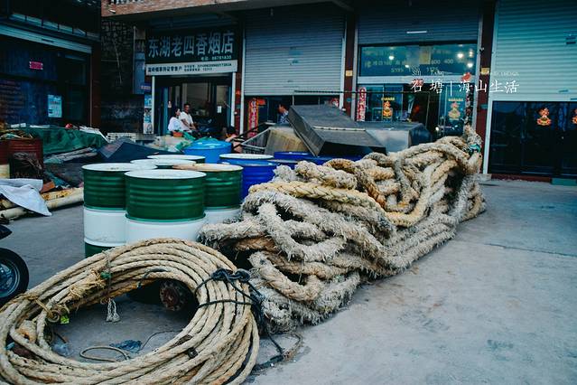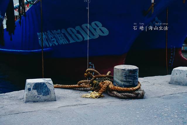 休渔期的 石塘 反倒能见到很多平时见不到的场景:脚脖子一样粗的绳子,还长着锈斑;船头印着“平平安安”字样的船只,还有就是悠悠闲闲享受休渔期的渔民们……