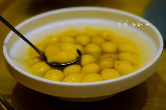 这个金黄色的圆子叫三粉圆,是用地瓜粉裹着各种馅儿,是甜品,过年都会吃的一种食物。很喜欢里面陈皮和白糖融合的味道,我很喜欢!有点江浙沪的甜口