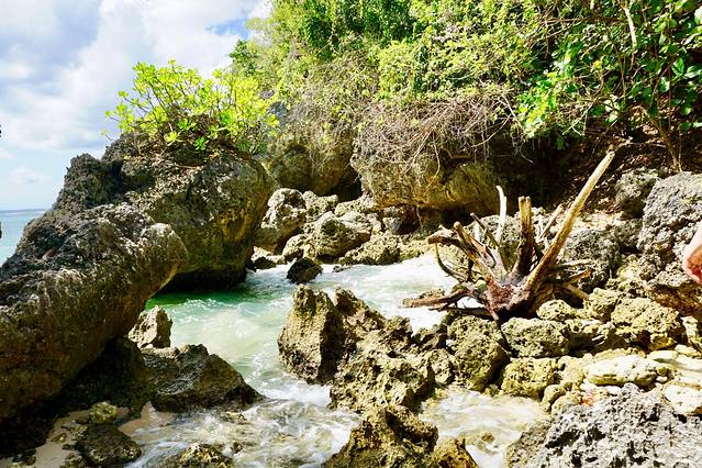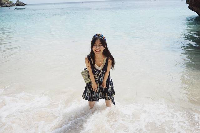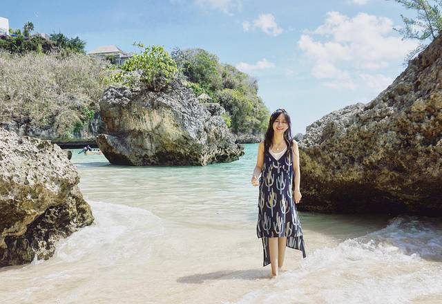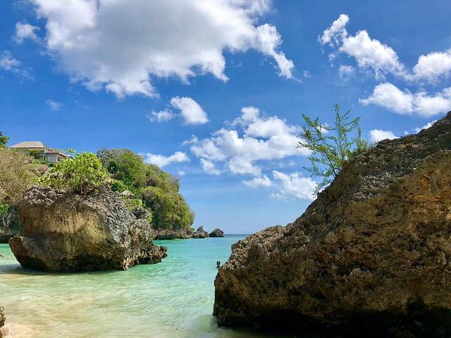 帕当帕当海滩(Padang Padang Beach)是《孤独星球》推荐的一个小众海滩,门票大概5块钱。走到海滩之前会步行经过一段木质台阶,台阶两侧是高耸的礁石,这段路走起来非常有趣。海滩上的商贩相对较少,和库塔、金巴兰那种比较商业化的海滩是完全不同的画风: