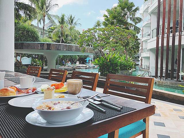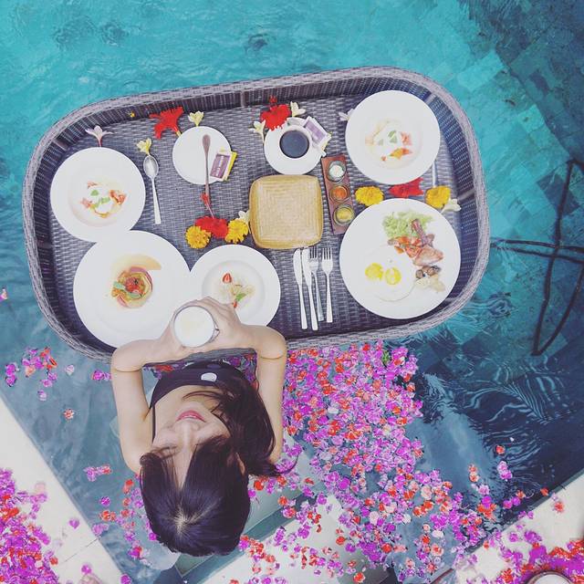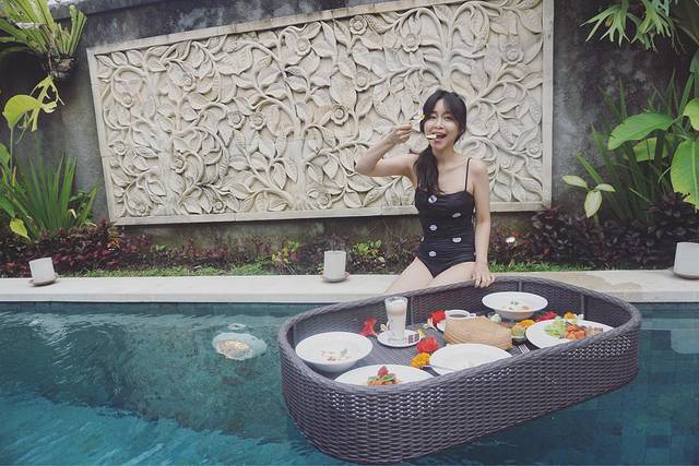 早餐可以选择去大堂二层,坐在梯田旁边吃;也可以送到房间,在庭院的泳池来个漂浮早餐。两种体验都挺别致的,直接上图: