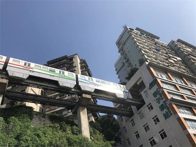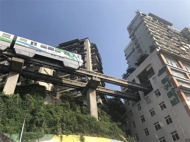 在李子坝站搭轻轨要上六层楼!我们没坐,只到上面看了看。