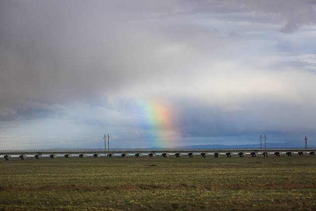 雨季的 可可西里 ,一边下着雨,一边是太阳。一道彩虹出现在铁轨之上。