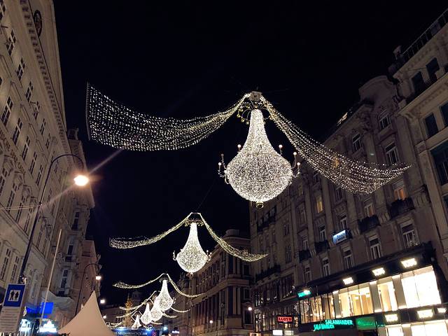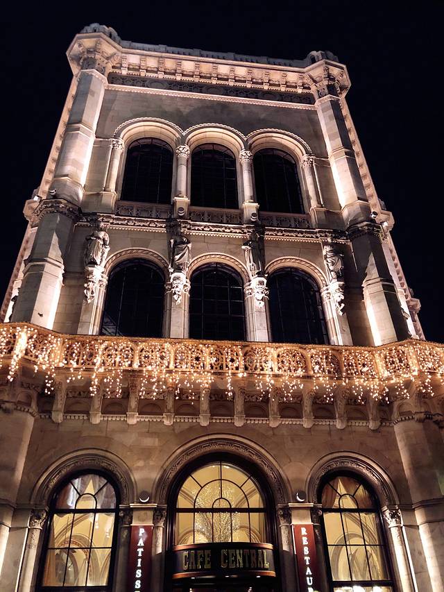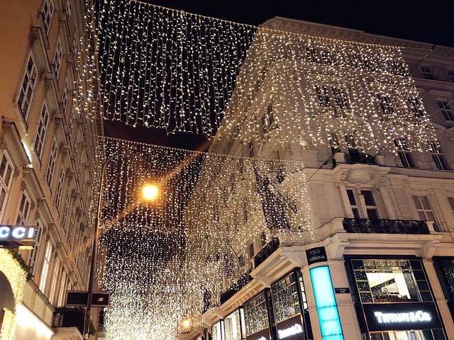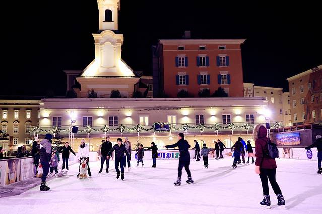出来觅食,走了两步就走到了莫扎特广场中心,冰天雪地下大家在莫扎特的背景音乐里溜冰。我们买了热狗和热巧,搓着手站在广场中央看大家欢笑的场景,想起《音乐之声》,取景地于此,真是浪漫非常了。