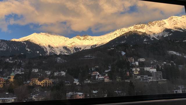 我们于晚上到达 因斯布鲁克 的火车站,打车直接到酒店。晚上天黑的早,小镇上安静的几乎没有路灯,我们还不明所以。直到第二天一早打开窗帘,两个人傻站在窗前被映入眼帘的金色的雪山震撼的说不出话