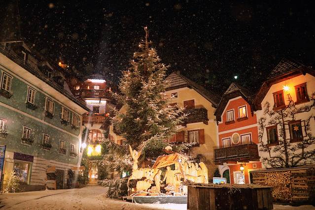 在 哈尔施塔特 的小小广场,不期而遇的幸运,雪下最美的这颗圣诞树