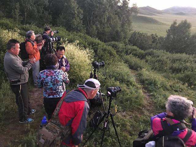 游客站在山坡上,山坡下是一条土路的跑马道。等到六点半左右,几十匹马被放出来准备就绪,但是马群并没有完全按照马道在跑,很多马跑到了山坡上,把观看的游客吓得直往山顶上跑。而且很多马并不是很愿意跑这一圈,一边慢慢溜达一边低头吃草。。。