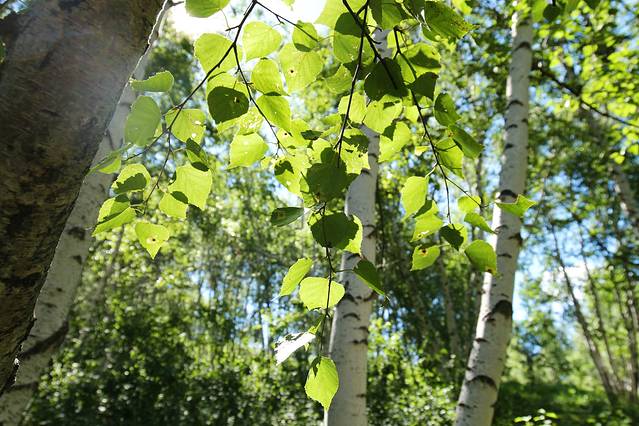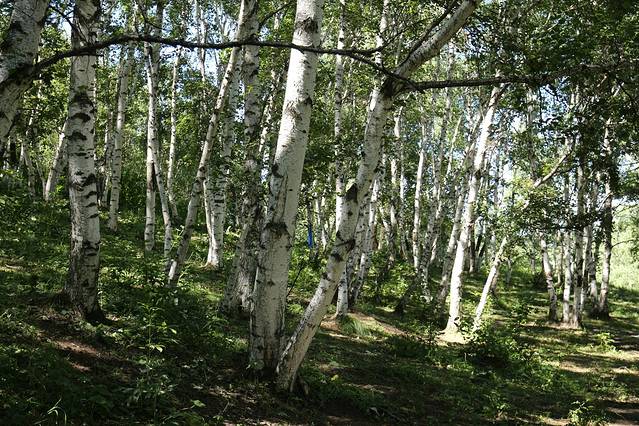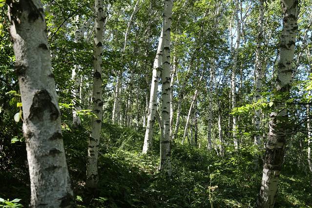 白桦林附近有很多车辆停靠,我们也下来拍了拍照,树林里凉快了很多,阳光从树林间穿过形成一道道光影,光线把叶片都变成了晶莹剔透的绿色。