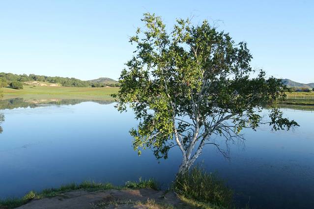 路上我们找了个景色不错的山坡,在树下阴凉地儿把早饭解决了,早饭依旧是我们带的面包点心啥的,继续向前开就到了红松湖~到了红松湖紫外线的照射已经变得非常强了,温度也在逐渐升高,从早上穿冲锋衣已经变成车里开空调了。