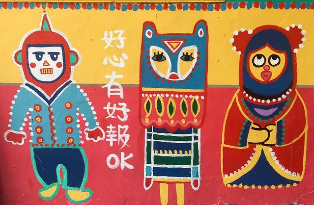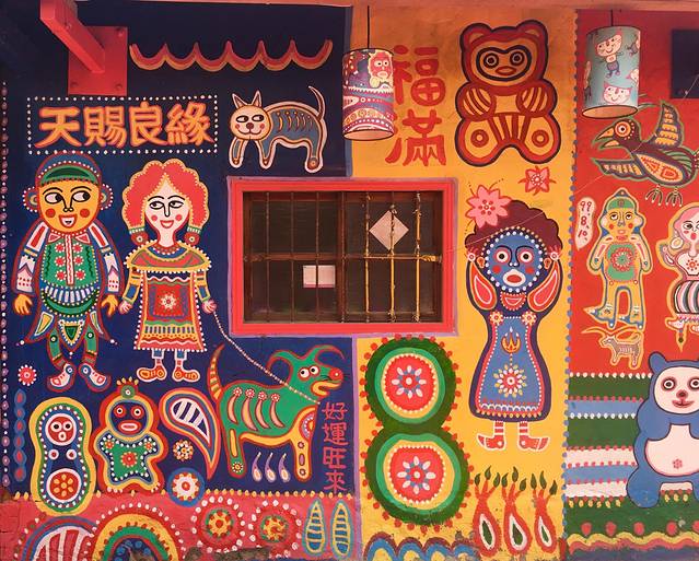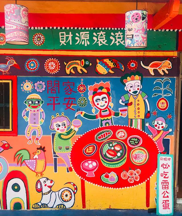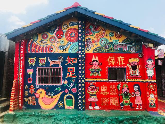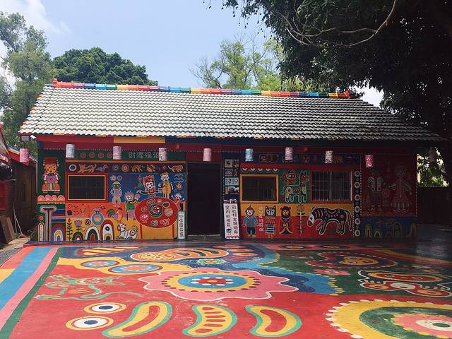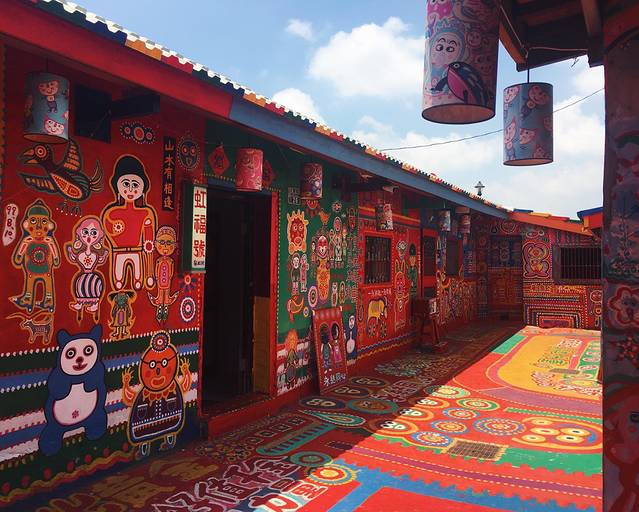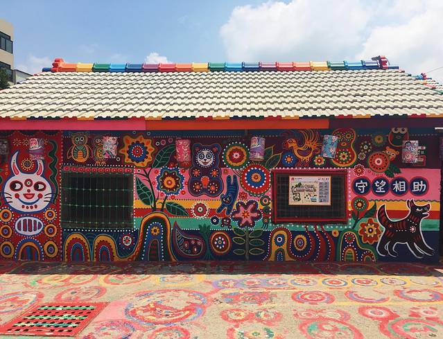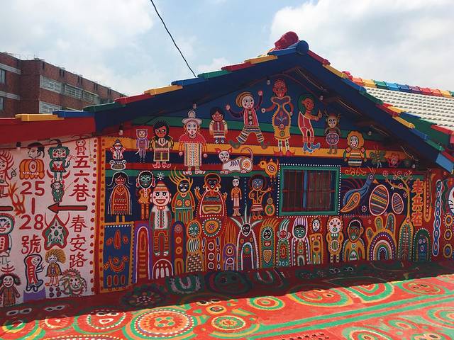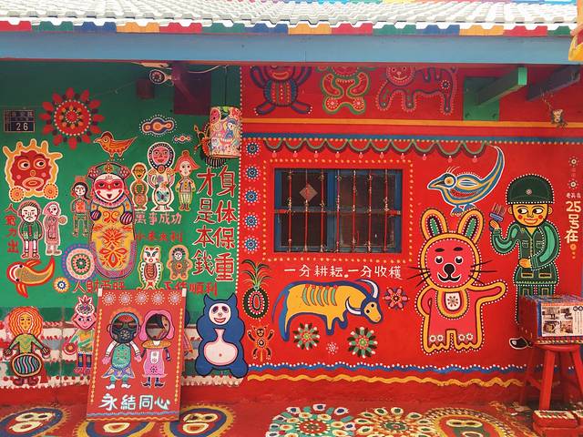 「彩虹眷村」,因为彩虹爷爷黄永阜「无聊」而拿起画笔将眷村内的巷弄彩绘了各式美丽的彩虹线条与可爱动物染亮了小村,因他的用色大胆,构图可爱并充满童趣,让我们有如置身彩虹世界,故网友称此处为「彩虹眷村」。