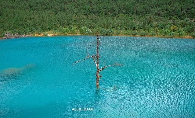 蓝月谷中的河水在流淌过程中因受山体阻挡,形成了4个较大的水面,人称玉液湖、镜潭湖、蓝月湖和听涛湖,站在高处远眺整个湖面,远看就像一轮蓝色的月亮镶嵌在玉龙雪山脚下。蓝月谷背靠雪山,这一静一动,大自然是多么的神奇。