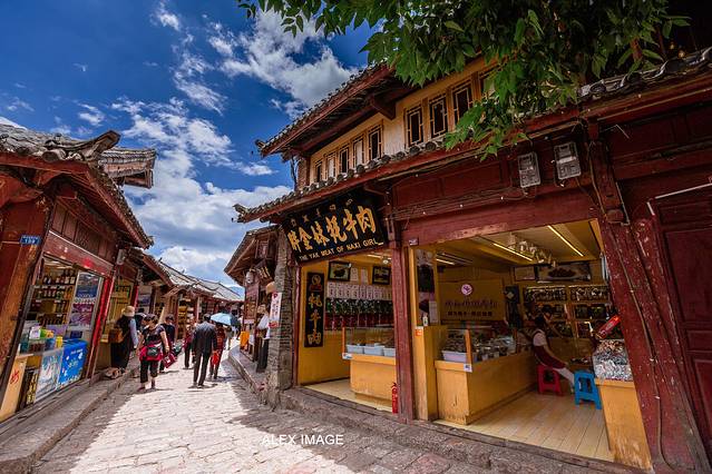 大研古城内的街道依山傍水修建,以红色角砾岩铺就,在古镇上开有很多代表当地文化特色的小店,纳西古乐、东巴纸坊、驼铃店等,在这里,可以逛一下午。