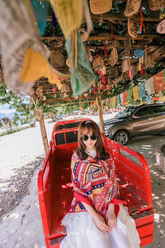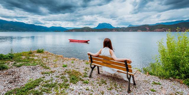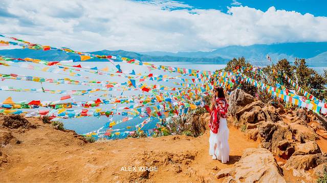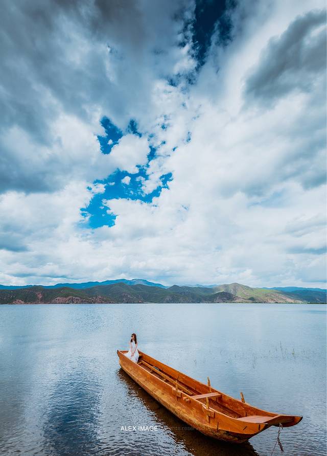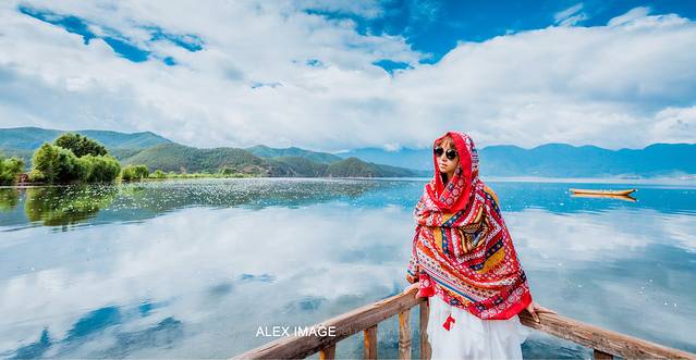 泸沽湖湖水湛蓝山湛清,建议穿着纯色的长裙,人物会显得很干净,大红色、白色都是不错的选择。