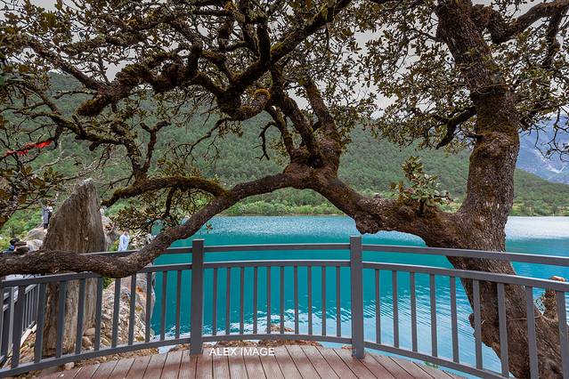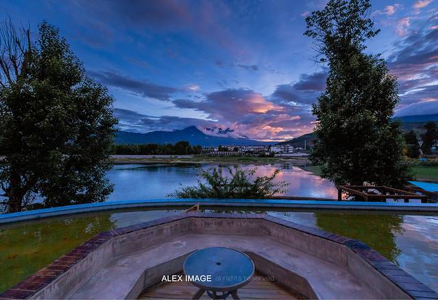 这里是观赏玉龙雪山及日落的绝佳地点,我们一大早就起来拍日出。瞧,早起的鸟儿有虫吃,登上平台,远处的玉龙雪山清晰地倒映在水中,太阳慢慢升起,在云层中绽放,染红了雪山和天空,分外妖娆。