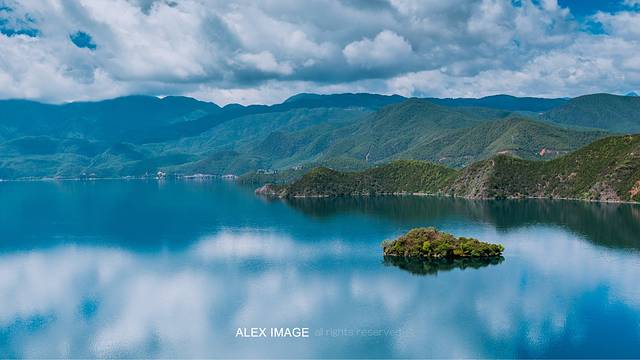 这里是包车师傅推荐的地方,没想到这么美。这里真可谓是泸沽湖的天空之镜,静静的湖面像无边无际的蓝色锦缎,蓝得纯净、蓝得醉人。