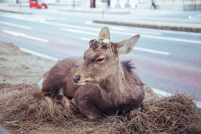 出站后不远就能看到鹿了,有的悠闲的躺在马路边小憩,而大部分都在跟游客讨食