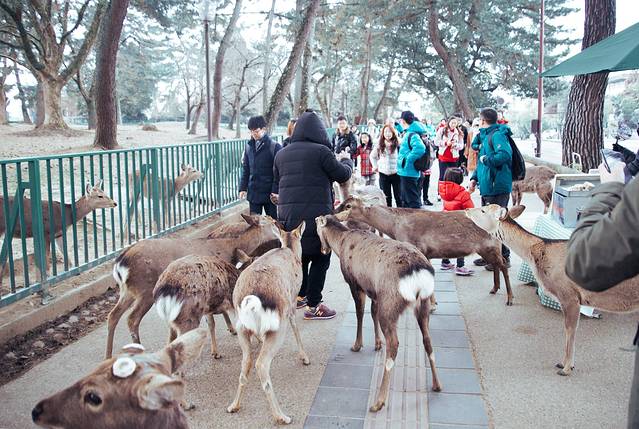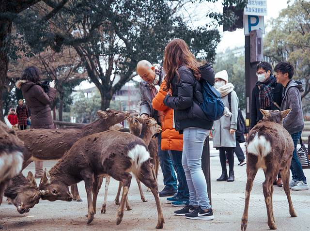 有个奇特的现象:鹿并不会去围着卖鹿饼的小摊,即使它们能够着那些饼。偏偏爱游客手里的饼