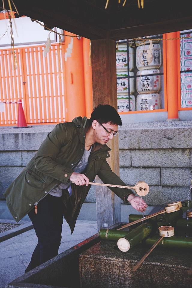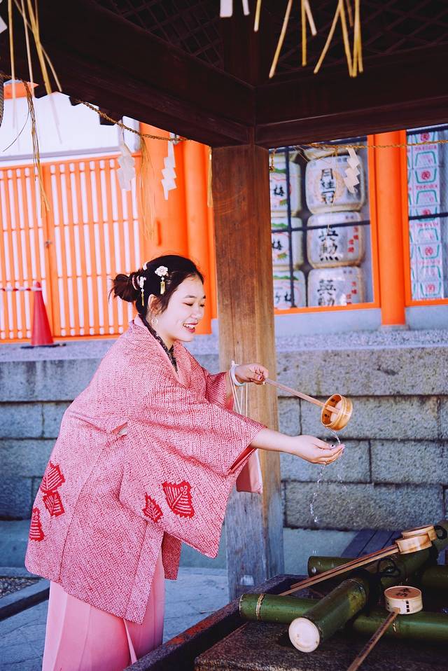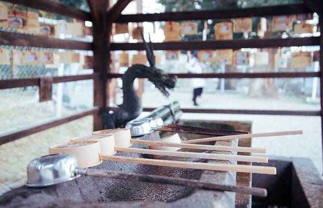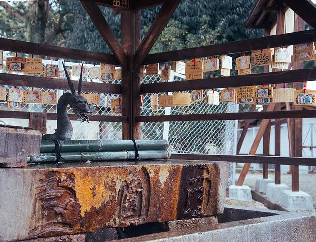 如要参拜,先要在手水舍清洗双手和口,以除去污秽,使身心清净。神社里都有这种御手洗,洗手也是有讲究的,先左手后右手,后面还要含一口,但别吞下去了。不过对大部分游客来说只是用来摆个拍的
