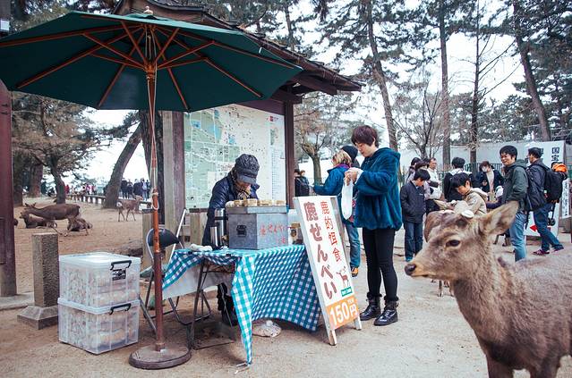 路边随处可见卖鹿饼的小摊,价格统一150円一打饼,慢慢喂也可以喂很久