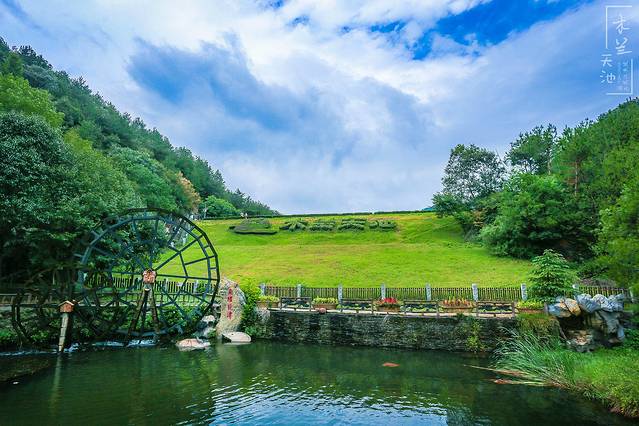 走进园区,首先看到的是苍翠的堤坝和缓缓转动的水车,迎面而来的是清新的空气。木兰天池的森林植被覆盖率达98%,可谓是天然氧吧。