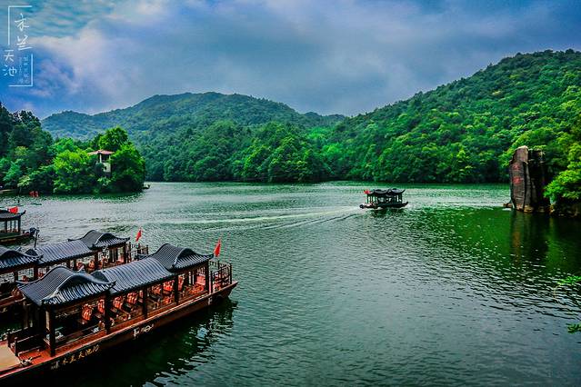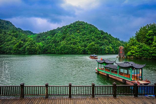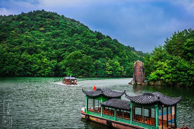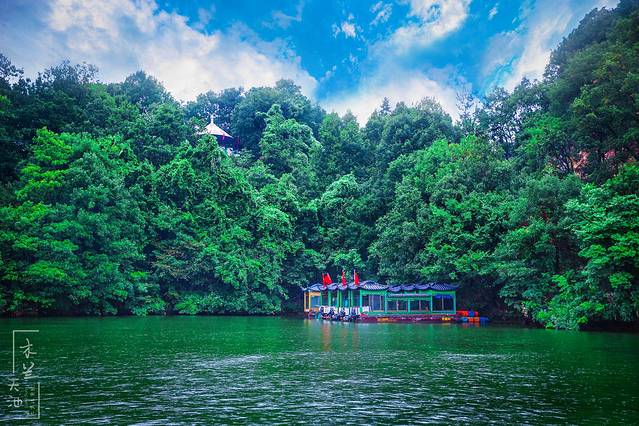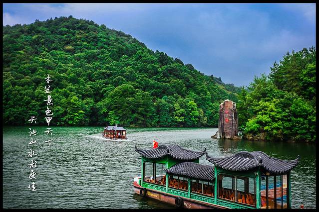 天池湖面上古色的画舫游船在游荡,碧绿的湖水中有了朱红色的点缀,绘就了一幅美丽的山水画。而坐在船上的游人,仿佛是徜徉于天地之间,如痴如醉。