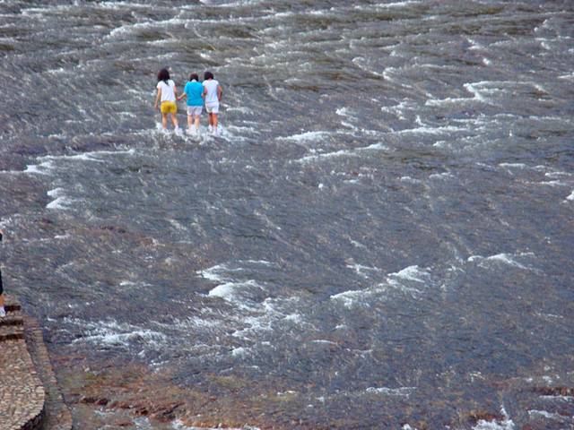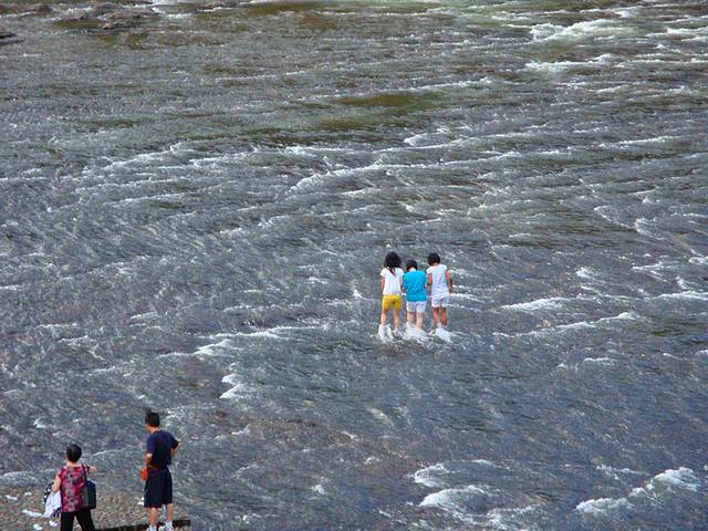 中洋。总板200多米,宽150米,面积3万多平方米,平坦如砥。溪水从石面轻轻流过,水深没踝。浅水广场的3块巨石旁矗立着3座大山峰,交汇处豁然开朗,人置身其中的心情也随之激荡,到过这里的人都赞不绝口,在全国确实是独一无二的,堪称“天下绝景”。特别是在盛夏。一个个都情不自禁地争先恐后下水潇洒走一回。白水洋散步以穿防滑袜子最适宜,走在水里一点不滑...