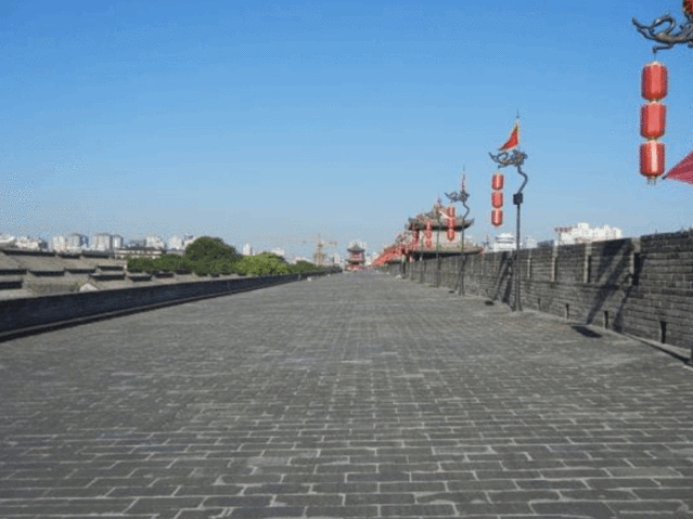 西安城墙是中国现存规模最大、保存最完整的古代城垣 ,是古老城市的醒目标志。古城墙四四方方是个长方形,东南西北有四个城门,长乐门(东门),永宁门(南门),安定门(西门),安远门(北门),每个门都可以上到城墙。