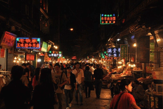 其实每个城市都会有一条很有名的小吃街供外来游客吃吃喝喝,也都大同小异,但回民街是我去过最有特色的一条街。青石铺路,绿树成荫,路两旁一色仿明清建筑。