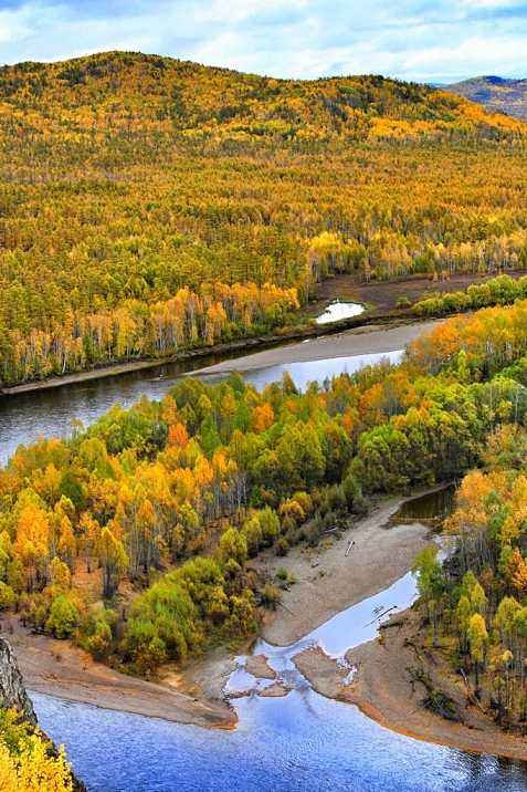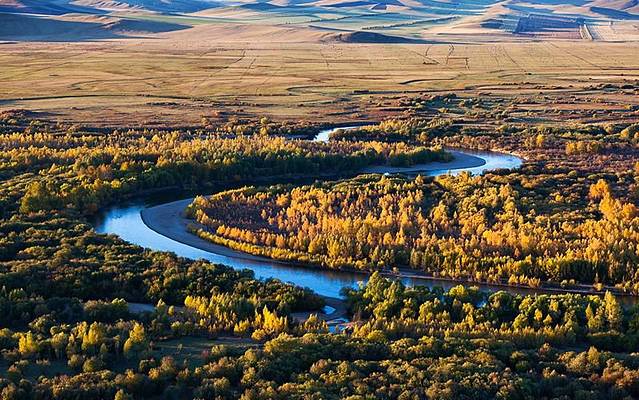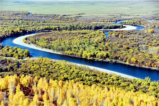 不知道朋友们可见过湿地,并且眷恋呢? 来到额尔古纳湿地,真是挺美的。 不同颜色的灌木,砖红色,渐变的黄色,深绿色… 再加上静静流淌着的河水