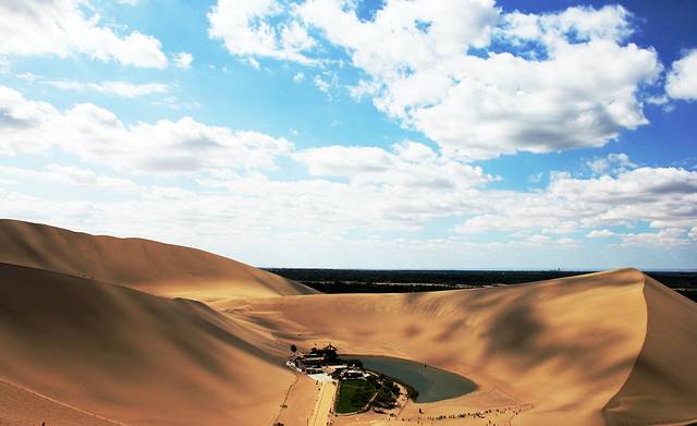 沙漠与泉水的结合,是风像侍卫一样,时刻吹赶着沙的移动,使沙与泉历经千年变迁仍能和谐相存。(沙漠还是很晒的,一定要做好防晒哦,另外保护好电子产品,可不要进了沙子。另外要备好防暑药品,在司机师傅的提醒下准备了一盒藿香正气水)