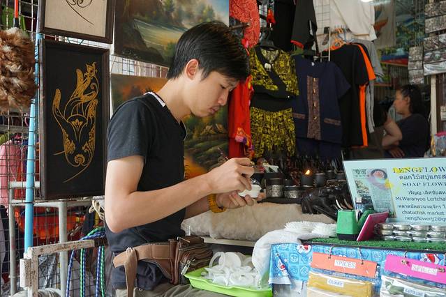 香薰蜡烛店的小哥在雕蜡烛花,刀法娴熟得让我想起了让人痛不欲生的设计基础课。