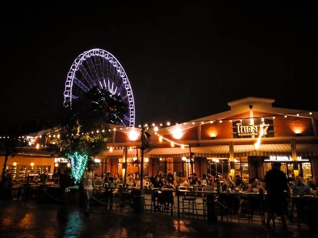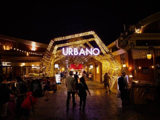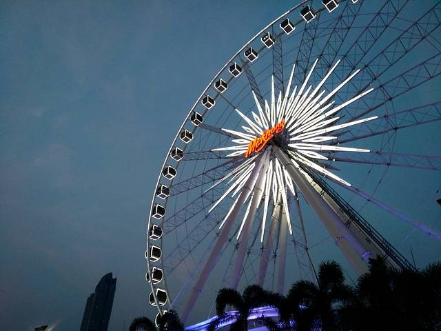 从siam坐公交车去【河畔夜市】(Asiatique The Riverfront)很方便,到达的时候天色也开始暗了些。灯光一亮,好像是白天的公园突然成了有点浪漫的夜市。