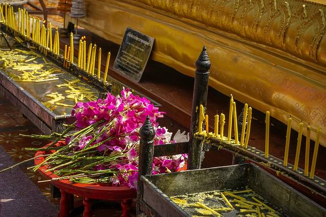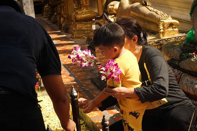 大家都拿着莲花在这边拜拜,紫色花瓣和金色倒是形成了美丽的反差,给神圣的氛围增添了一些浪漫色彩。