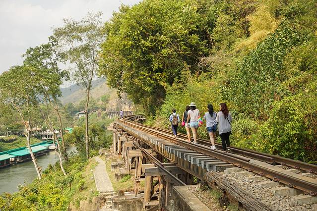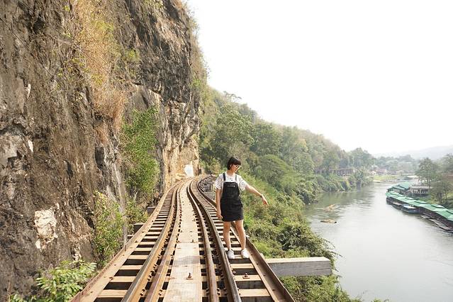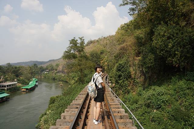 桂河大桥只是整个泰缅铁路的一小部分。泰缅铁路是世界著名的“死亡铁路”,这一是由于这条铁路是上万个建造工人用生命换来的,二也是因为它的地势险峻。导游带着我们体验了整条铁路最惊心动魄的一段,我妹站到铁路边上拍照时我吓得心都发抖了。