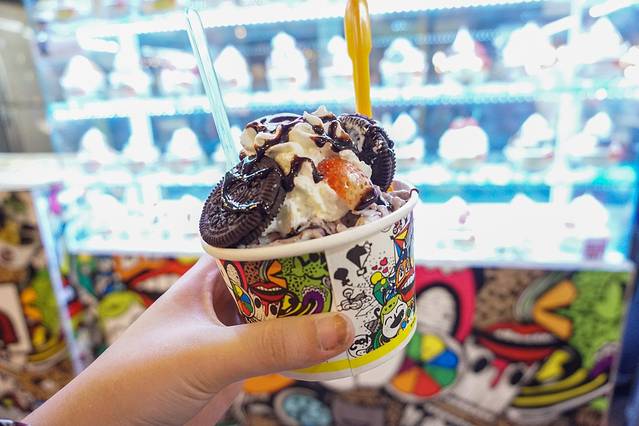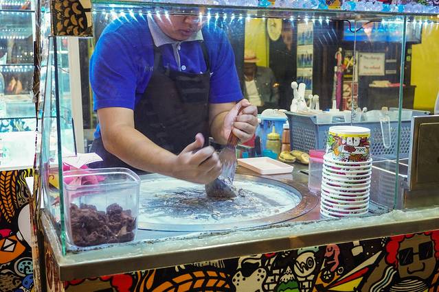 不过夜市里面倒是有技术炫酷的炒酸奶,差不多100B一杯,料加超多!但是谁买炒酸奶的真实目的的不是为了看他们的表演呢!