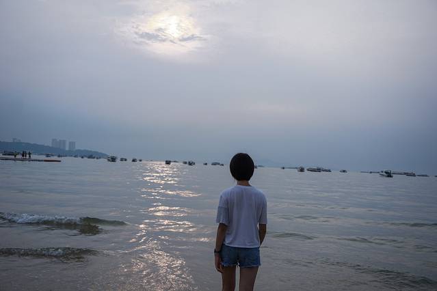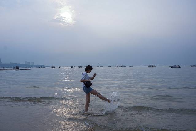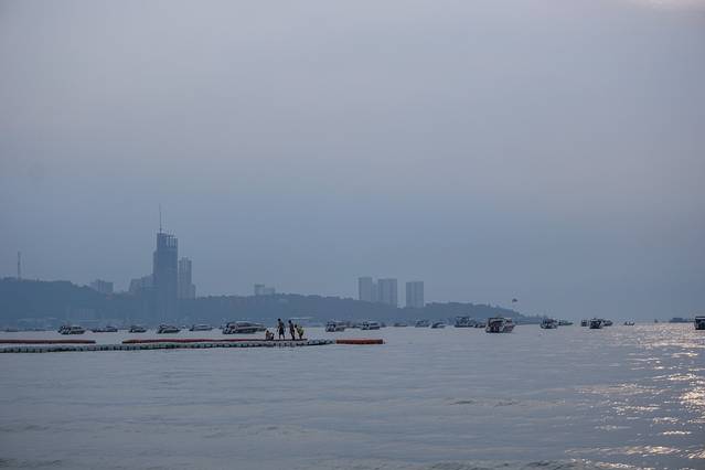 我们到 芭提雅 的这个下午天气不大好,刚刚下完小雨,天还没有完全放晴。我们只在海滩路随意逛了逛,海面上很多正在玩飞行伞拖曳伞和摩托艇的人,也有很多拿着水上项目价目表的人用中文问我们要不要玩。我们想着时间不早啦,明天再玩吧!没想到玩沙子玩水也一直玩到了太阳下山。