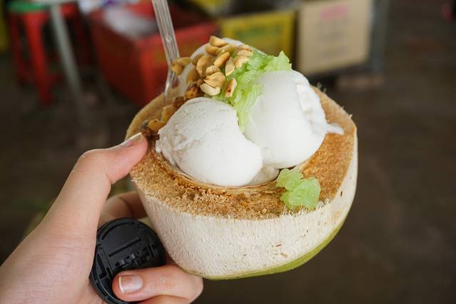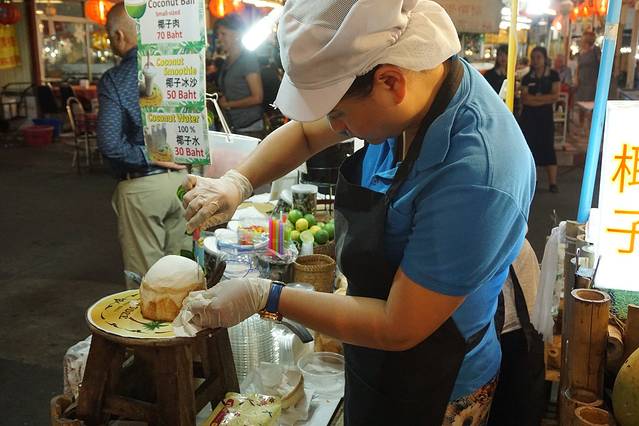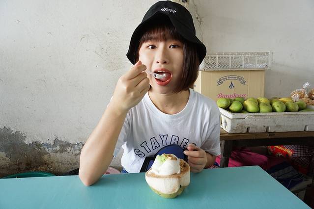 这边还有一个厉害的小吃,是把椰青里面的整个椰肉球刨出来!第一次看的感觉真是太爽了,雪白的椰肉整个就从椰子壳里面倒出来,可以全部吃掉,还可以插吸管进去喝椰子水哎!