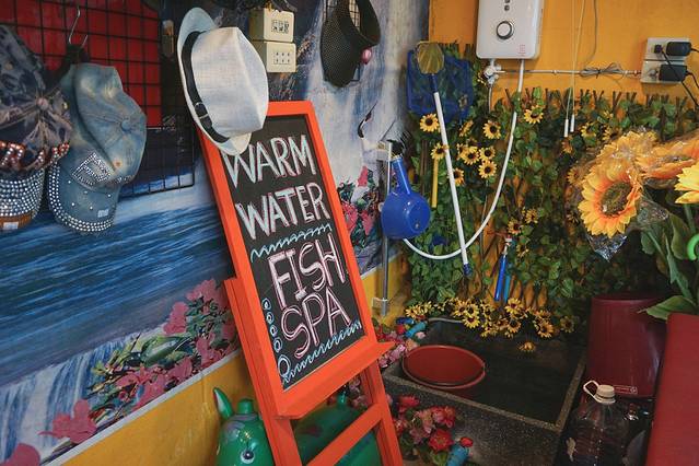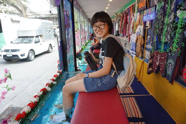 这家店的价格是100泰铢/15分钟,150泰铢30分钟的样子,有一点小贵。其实后来见到夜市也有不少做鱼疗的小商铺,价格会便宜些,但是环境是没有这么好,而且会在所有人面前泡脚哎!好像有点尴尬。