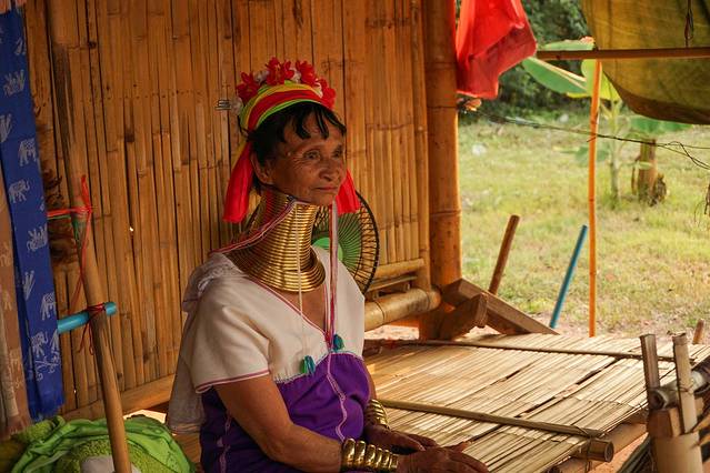 现在有几个长颈族村落已经对外开放成了旅游景点,主要靠景点门票和出售手工织的围巾等来赚取一些生活费。带了颈环的女生和妇女们听说有游客到来,也都会来到户外活动。大家都很友善,拍照也都很配合。只是当我看到族里一些还没戴颈环的小女孩在空地上奔跑玩闹的时候,心里还是会有点酸酸的。