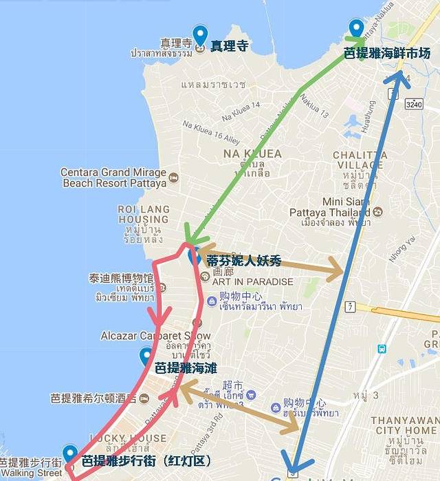 芭提雅 可玩的景点不太多,最出名可以算是【蒂芬尼人妖秀】,天气好的时候长长的【海滩路】也许会是休闲放空和玩水上项目的好地方。到了晚上,【步行街】就成了我爸妈禁止我和我妹去的地方,幸好还有个当地的【海鲜市场】,让我们吃的也超开心。