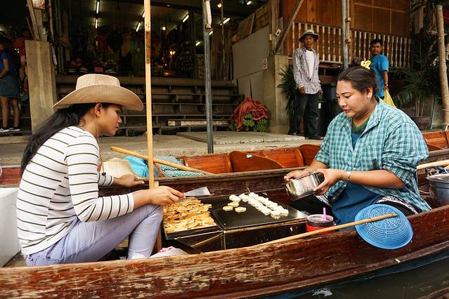 【丹嫩沙朵水上市场】可以说是 曼谷 名气最大的水上市场了。卖各种小吃、工艺品的小船就在河道两侧停着,也有不少商人在船上就开炉现做小吃。而观光和买东西的小船就在河道中间穿梭,遇到喜欢的随时都可以停下来讨价还价。周末的丹嫩沙朵热闹非常,最窄的河道还一度塞船,我们的船夫努力了好久也没办法挤进去,和想象中的水上市场一模一样。
