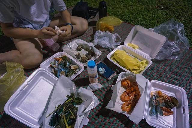 虽然爸妈特别叮嘱在 芭提雅 不可以在外面待到太晚,我们两个还是兴高采烈地坐上了北段的双条车,跑到了他们当地人的【海鲜市场】。明明两个人都不懂海鲜的价钱,不懂得怎么挑选好的海鲜,也不知道什么应该烤什么应该蒸,不过大概也是因为这样,在公园铺开地垫一边喝饮料一边吃的时候,才会觉得特别满足开心。